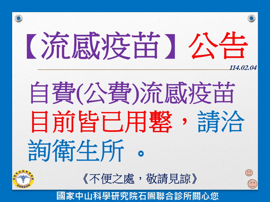 石園聯合診所公費、自費流感疫苗皆已用罄