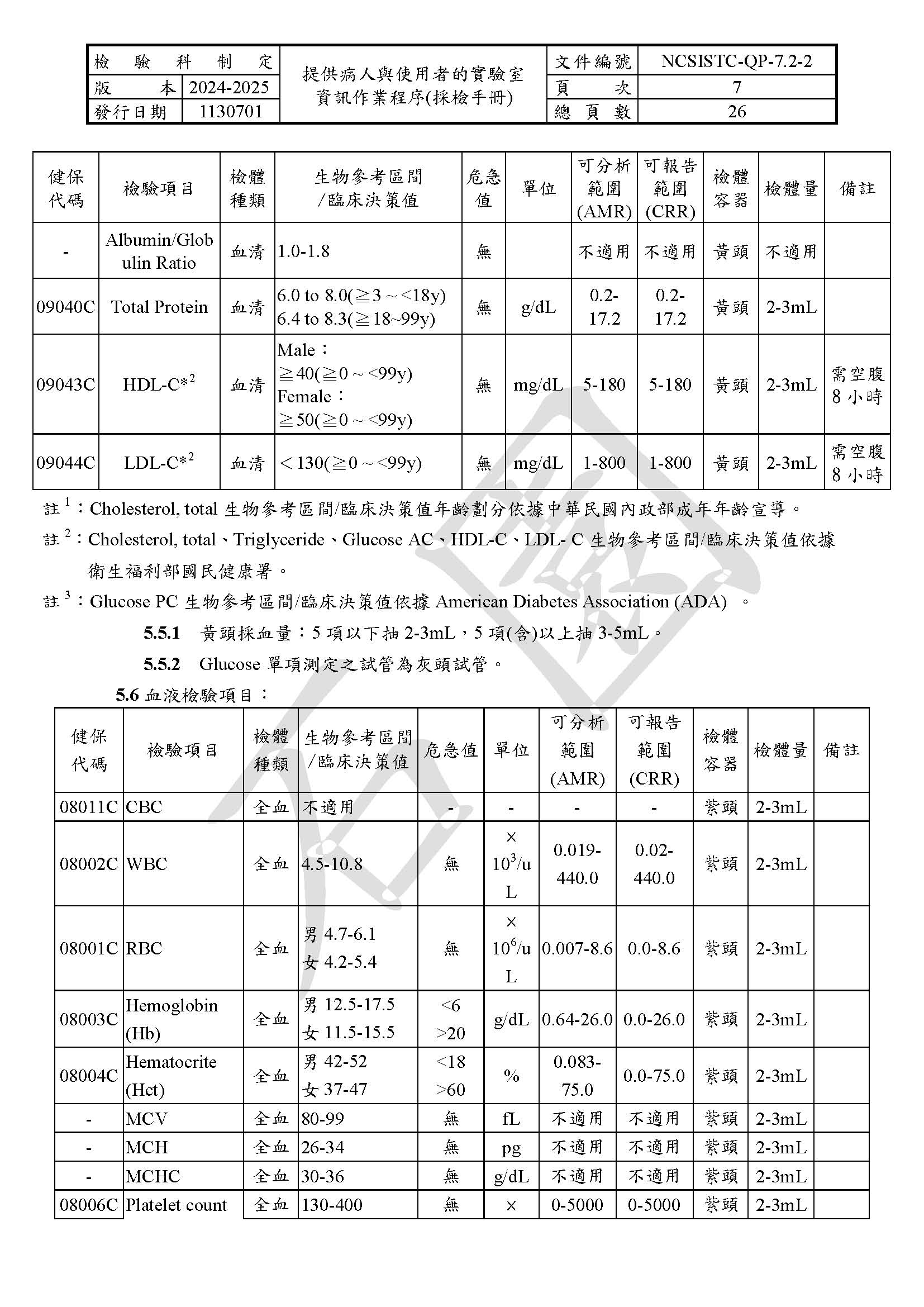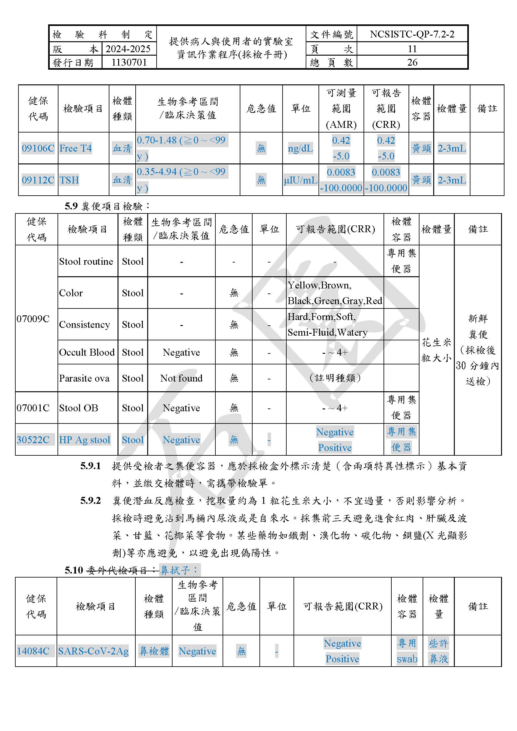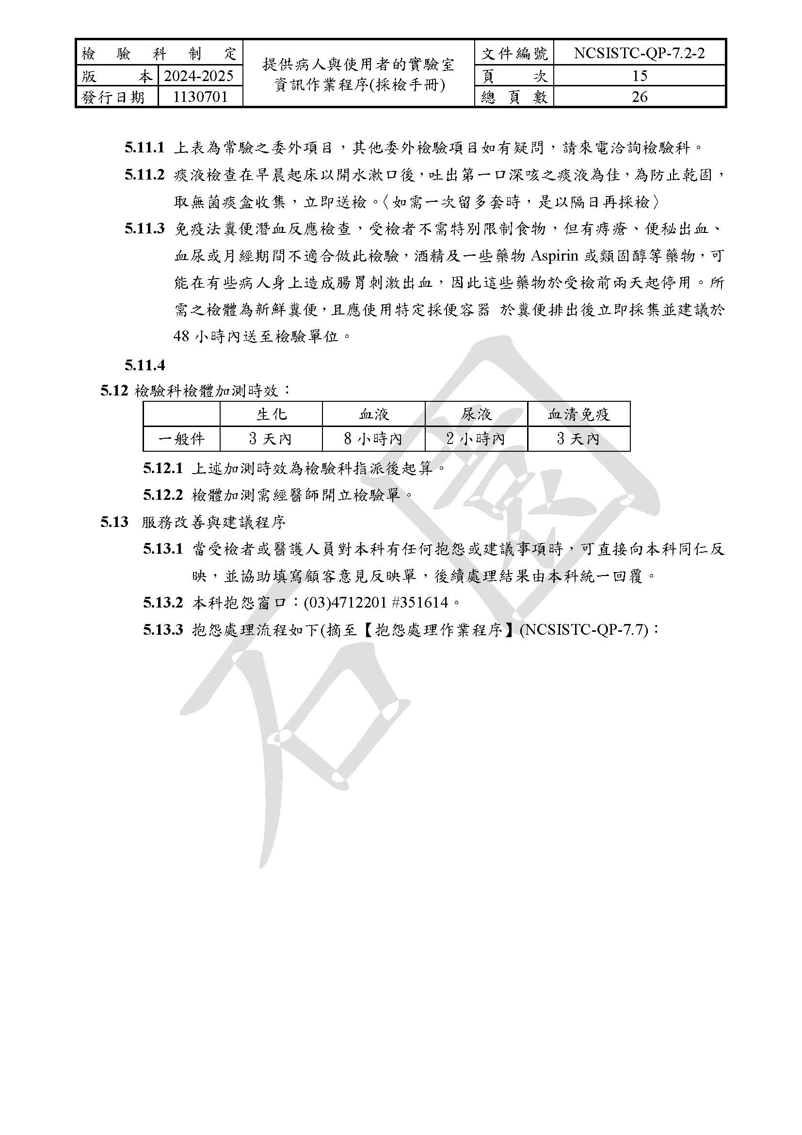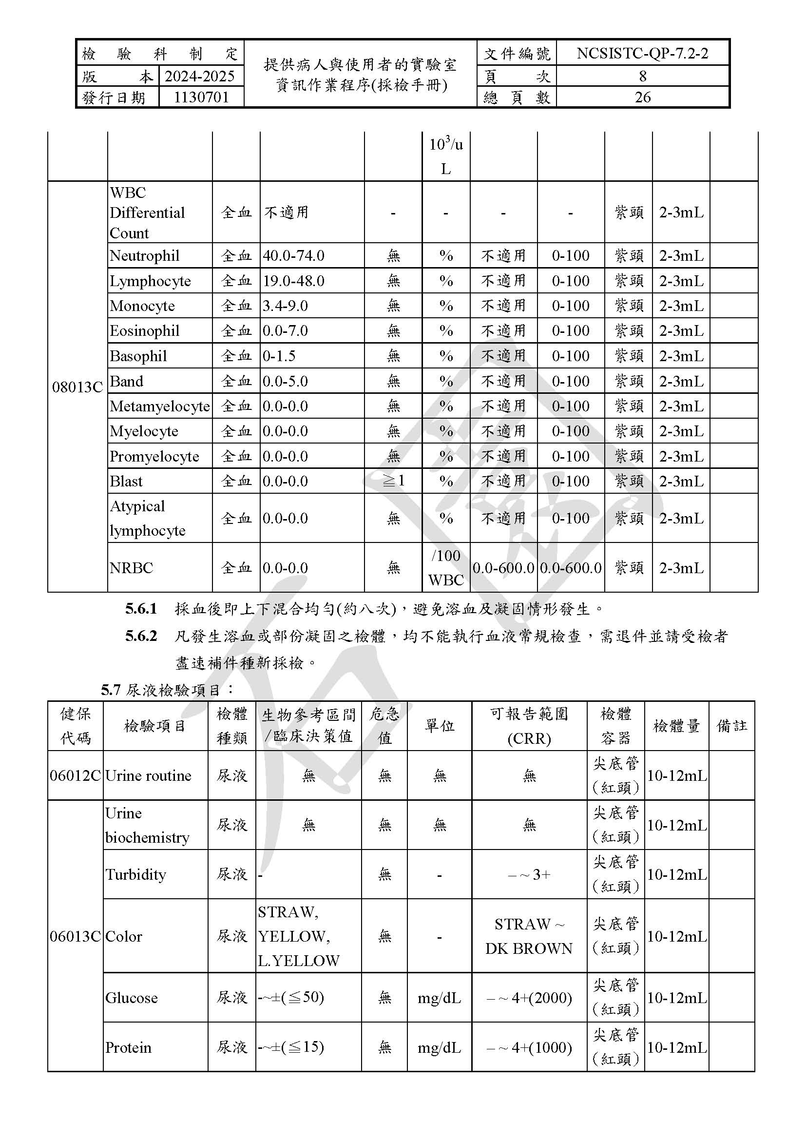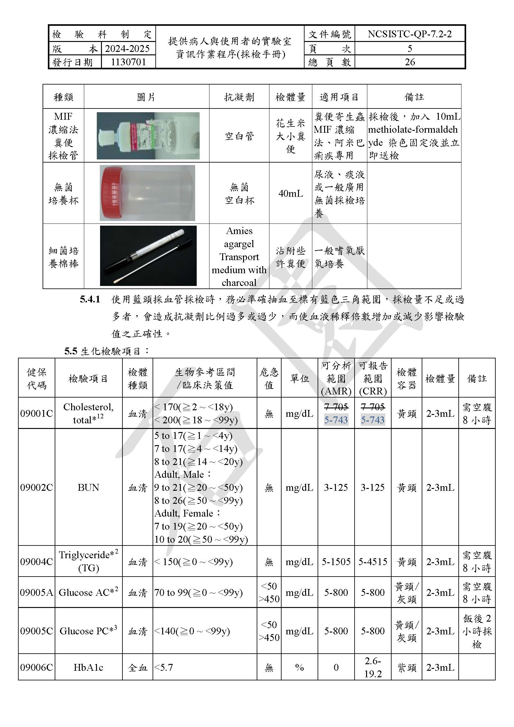 提供病人與使用者的實驗室資訊作業程序(採檢手冊)